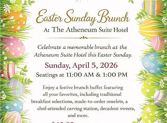 Celebrate a memorable brunch at the Atheneum Suite Hotel this Easter Sunday. Join us on Sunday, April 5, 2026, with seatings at 11:00 AM and 1:00 PM, and enjoy a festive brunch buffet featuring all your favorites, including traditional breakfast selections, made-to-order omelets, a chef-attended carving station, decadent sweets, and more.